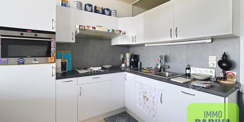 GLV.: Leefruimte (35m²) - open keuken voorzien van alle nodige comfort - aparte slaapkamer (10m²) - badkamer met toilet, lavabo en douche - bergruimte met wasmachine.
