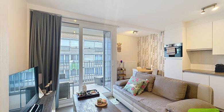 De lichtrijke leefruimte vormt het hart van het appartement en sluit naadloos aan op de open keuken, die uitgerust is met alle nodige comfort voor dagelijks gebruik of vakanties. Dankzij de aangename indeling is er plaats voor een gezellige eethoek, ideaal om te genieten van een ontbijt of diner in alle rust. Aansluitend is er een praktische berging met aansluiting voor een wasmachine — een duidelijke meerwaarde.
